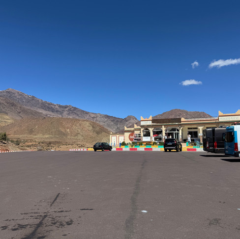 After walking through Aït Benhaddou we rode of another hour and a half before stopped for lunch. We stopped part of the way up the Atlas Mountains on our way to the Tizi n’Tichka Pass at Ighren N’Ougdal at Café Resto. It doesn’t look like much from the outside but the inside was quite nice. We managed to get a small chicken pizza for lunch which we shared.