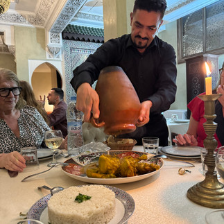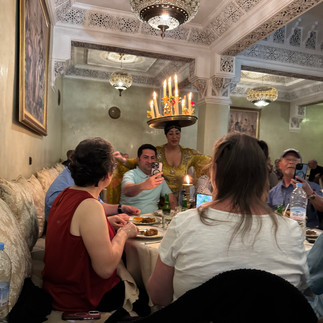 The ambiance was “upscale”. Carpets on the floor, light green walls with paintings, intricately carved pillar capitols and ceiling joists. There were men with drums and violins (which probably aren’t a traditional Moroccan instrument), belly dances, the men and women were in “traditional clothing”, there was a dance with scarves, a lady with candles on a tray on her head, so a proper floor show for tourists.