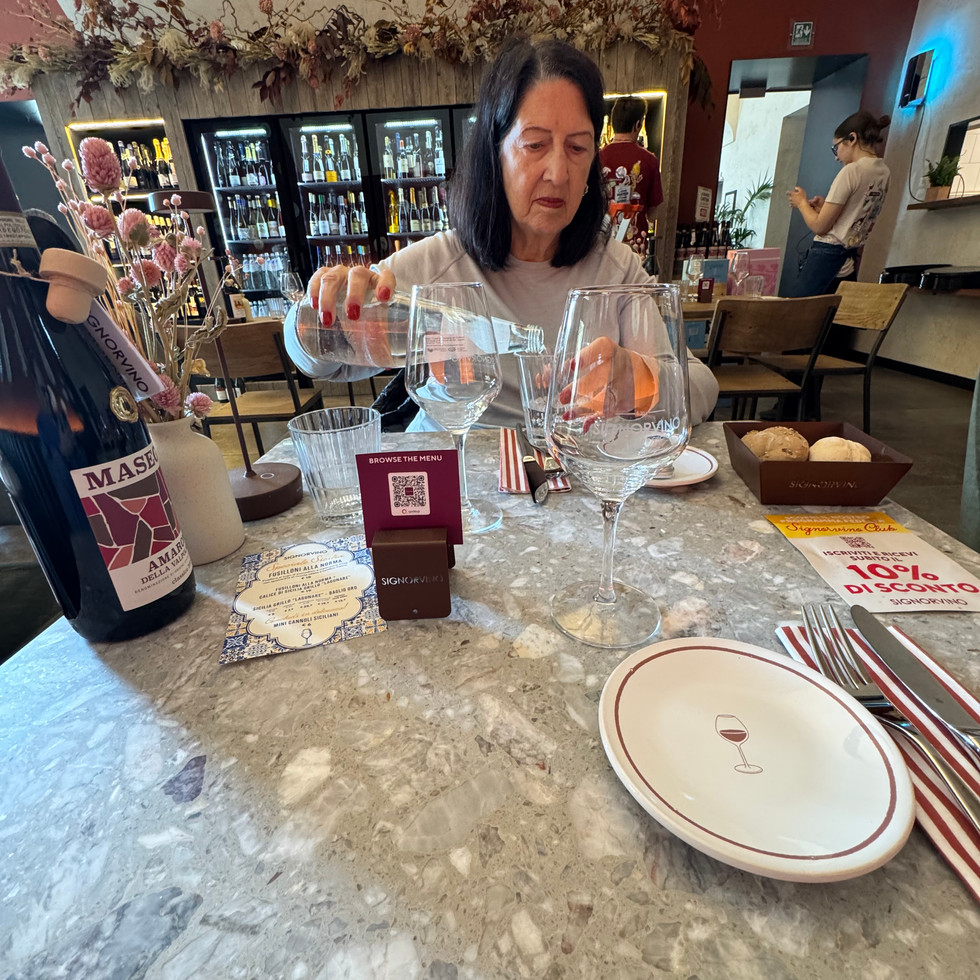 Gloria arrived shortly after we returned to the house. Gloria them packed up the girls and went off to Luisa’s dance lesson(?). We decided to go have lunch at Signorvino a new wine store and restaurant which opened in Piazza Vittorio Veneto just a few meters from Serra’s. We have watched the construction of the restaurant for probably nearly a year. The wine shop is really quite nice and they carry a good number of different wines. The prices seemed a little high, but then the older I get the higher things seem to get. :>)