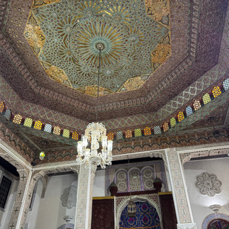 We boarded back on the motor coach and headed to the Medina. We then spent the next couple hours walking through the Medina. It is a colorful palace, much like the market in Istanbul but not as neat and organized. We saw olives of every type. Merchants selling colorful wools and garments. We went by several mosques which at one point were the places of learning. We in went into a building that once housed a madras.