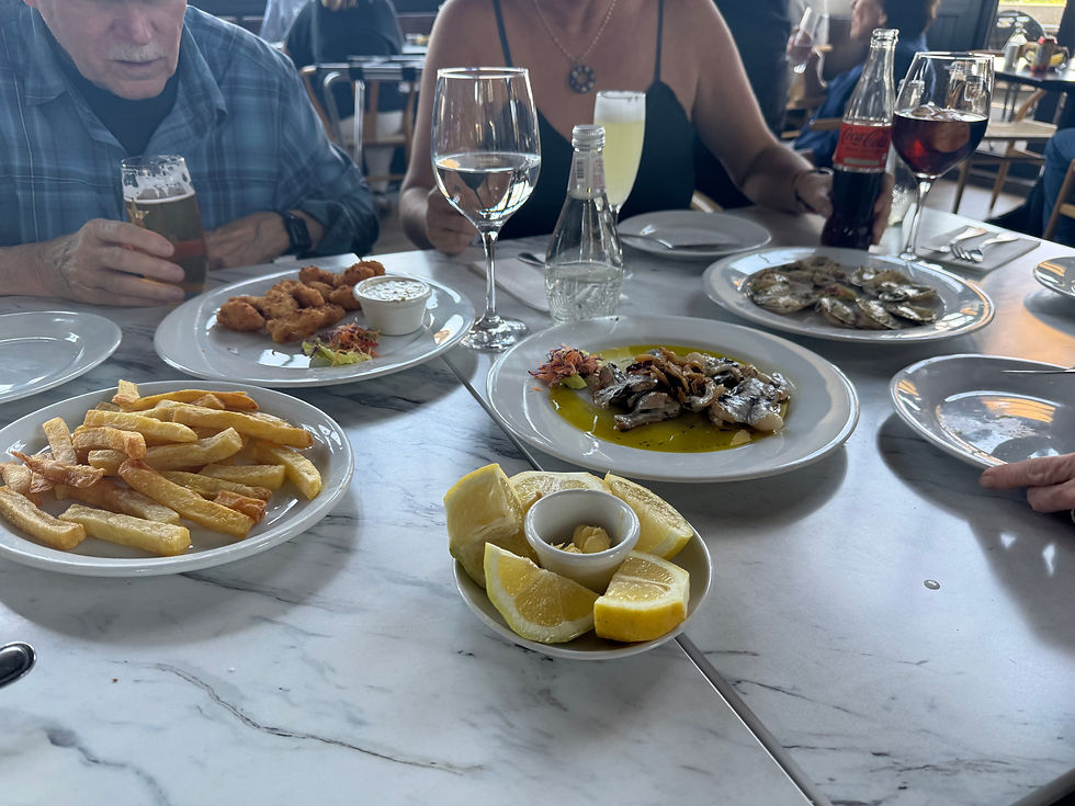 The first round of dishes was: Machas A la Parmesana, Calamar A Romana, Kokotxas, and lastly Papas Fritas. Apparently, there was some dispute between Maria and the waiter. Some of the things she wanted to order weren’t available, so she had to substitute for things which re go but not so much Chilean.